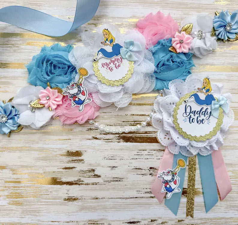 🐇 Step into a Wonderland Celebration– This enchanting badge set features beloved Alice in Wonderland characters, pastel florals, and whimsical ribbon accents—perfect for themed baby showers and gender reveal parties.