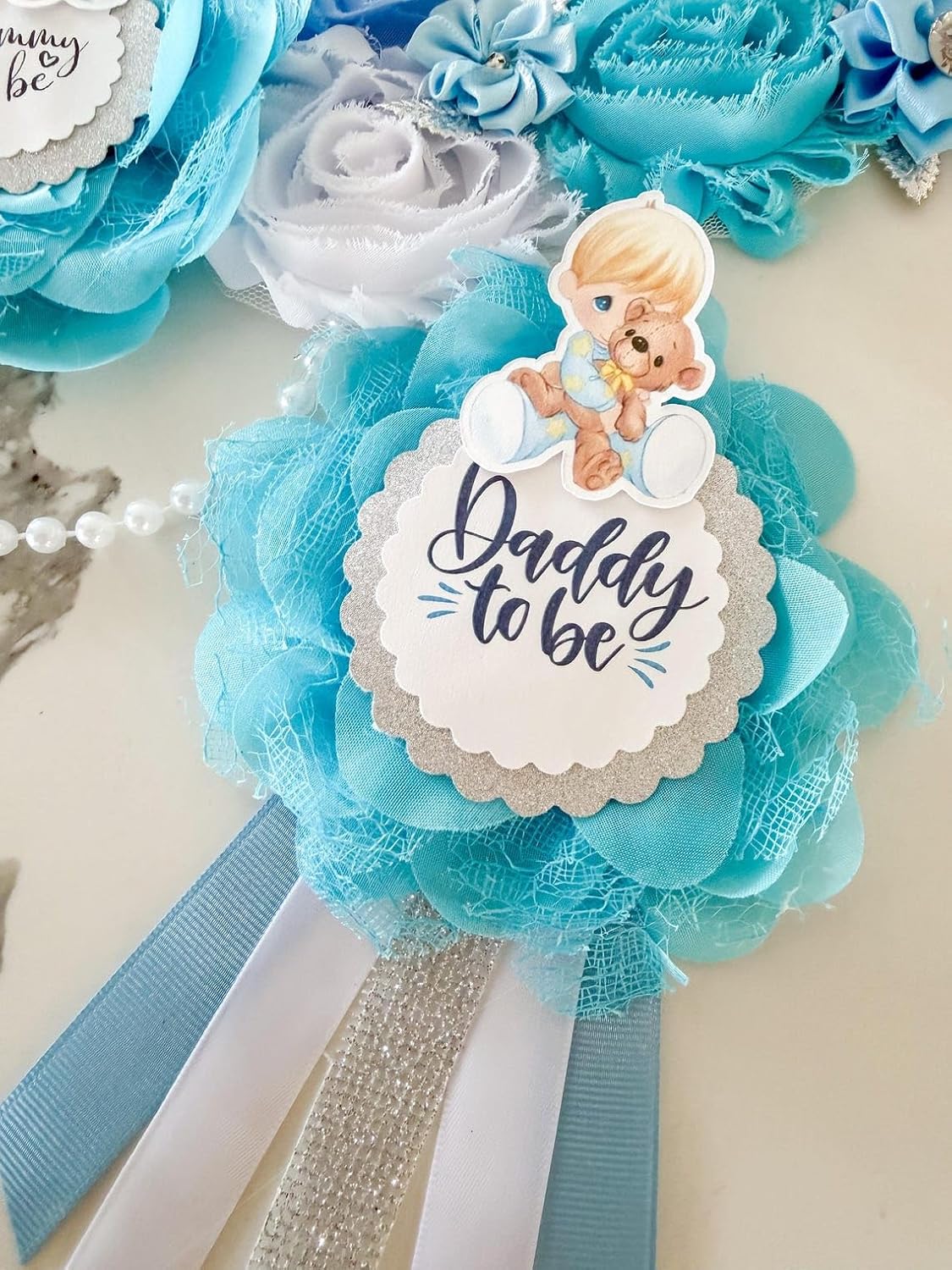 π Complete Baby Shower Set for Parents-to-Be β Includes a gorgeous Blue Mommy To Be Sash and matching Daddy To Be Pin, featuring adorable Precious Moments Teddy Bear artwork for a heartwarming celebration.