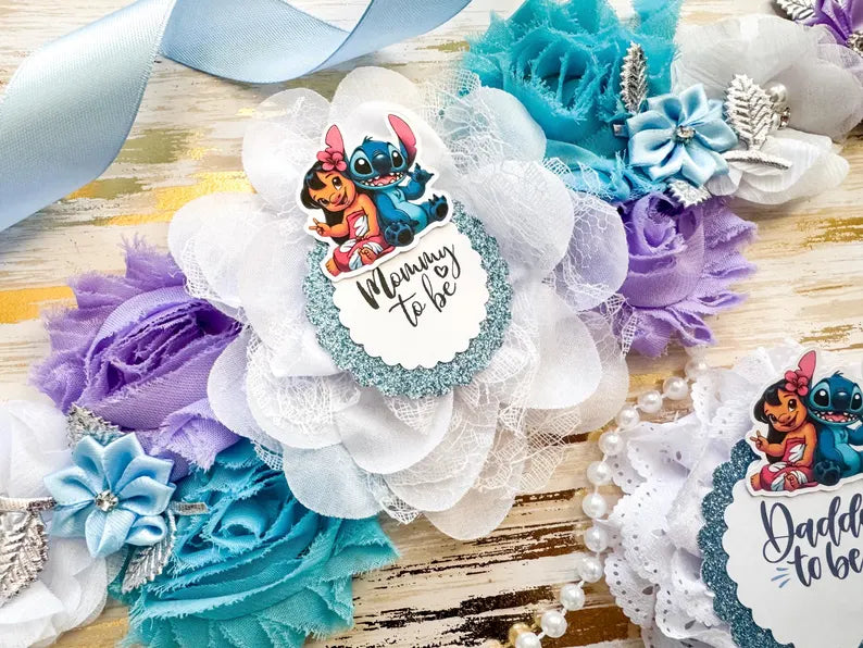 🐾 Celebrate Parenthood with Stitch & Angel Magic– This themed badge set features beloved Lilo & Stitch characters, soft florals, and layered ribbons—perfect for baby showers and gender reveal parties with a whimsical twist.