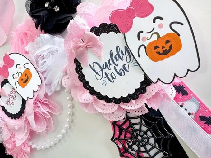 🎃 Matching “Daddy to Be” Badge – Includes a coordinating pin with a pink-bowed ghost and layered ribbons, making both parents feel special and photo-ready.