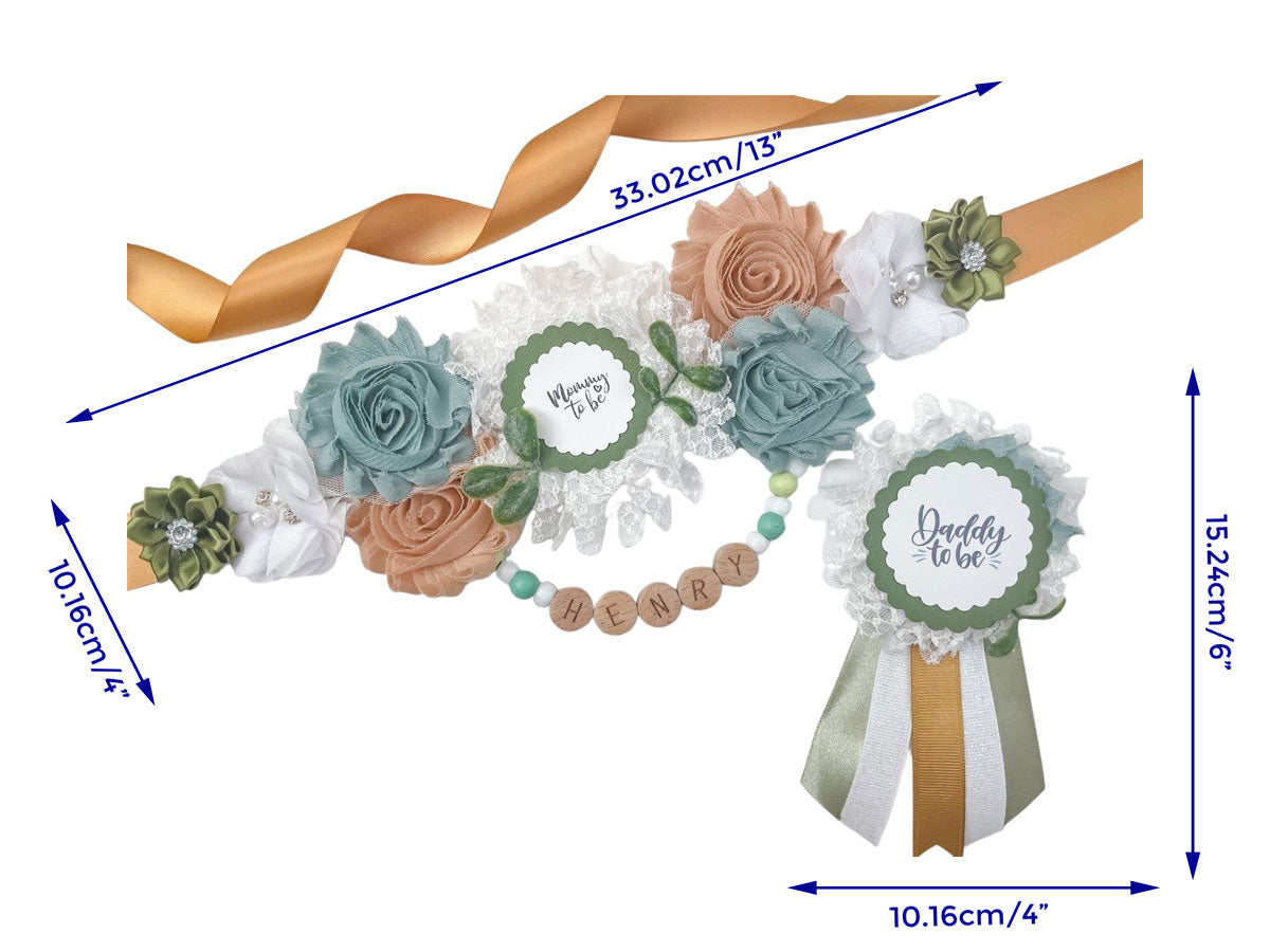The "Sage Greenery Baby Name Baby Shower Maternity Sash" is a stylish and modern accessory for expecting mothers, designed with a Sage Greenery theme and the space to add the baby's name to add a touch of elegance and style to any outfit.