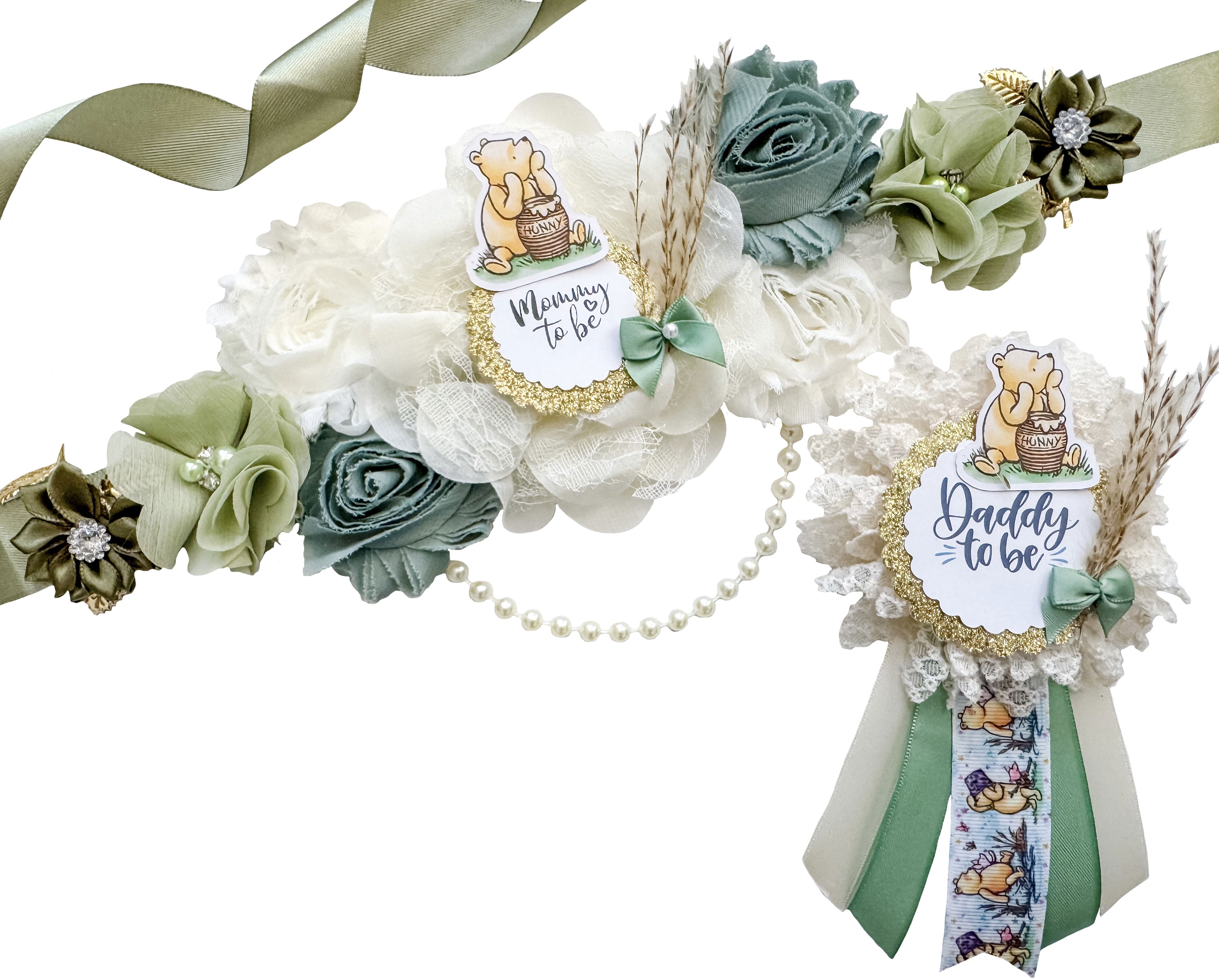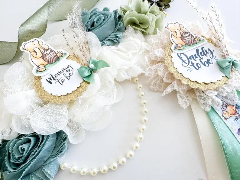 🍼 Mommy & Daddy to Be Badges – Includes a floral “Mommy to be” corsage and a matching “Daddy to be” rosette pin with printed Pooh ribbon streamers. Both feature cartoon illustrations and elegant script fonts.